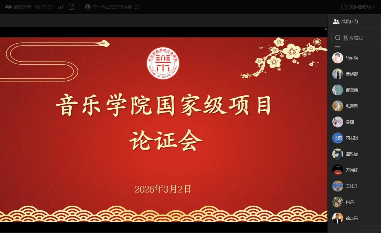 拟申报项目的各位教师依次围绕选题进行了简要汇报,申报选题方向多元,涵盖音乐学、作曲理论、音乐表演、舞蹈学及跨学科研究等多个领域。三位专家认真听取了每位教师的汇报,并结合自身丰富的科研经验和评审经历,进行了细致深入地点评与指导,并鼓励青年教师坚定信心、精益求精,在反复打磨中不断提升申报文本的质量。