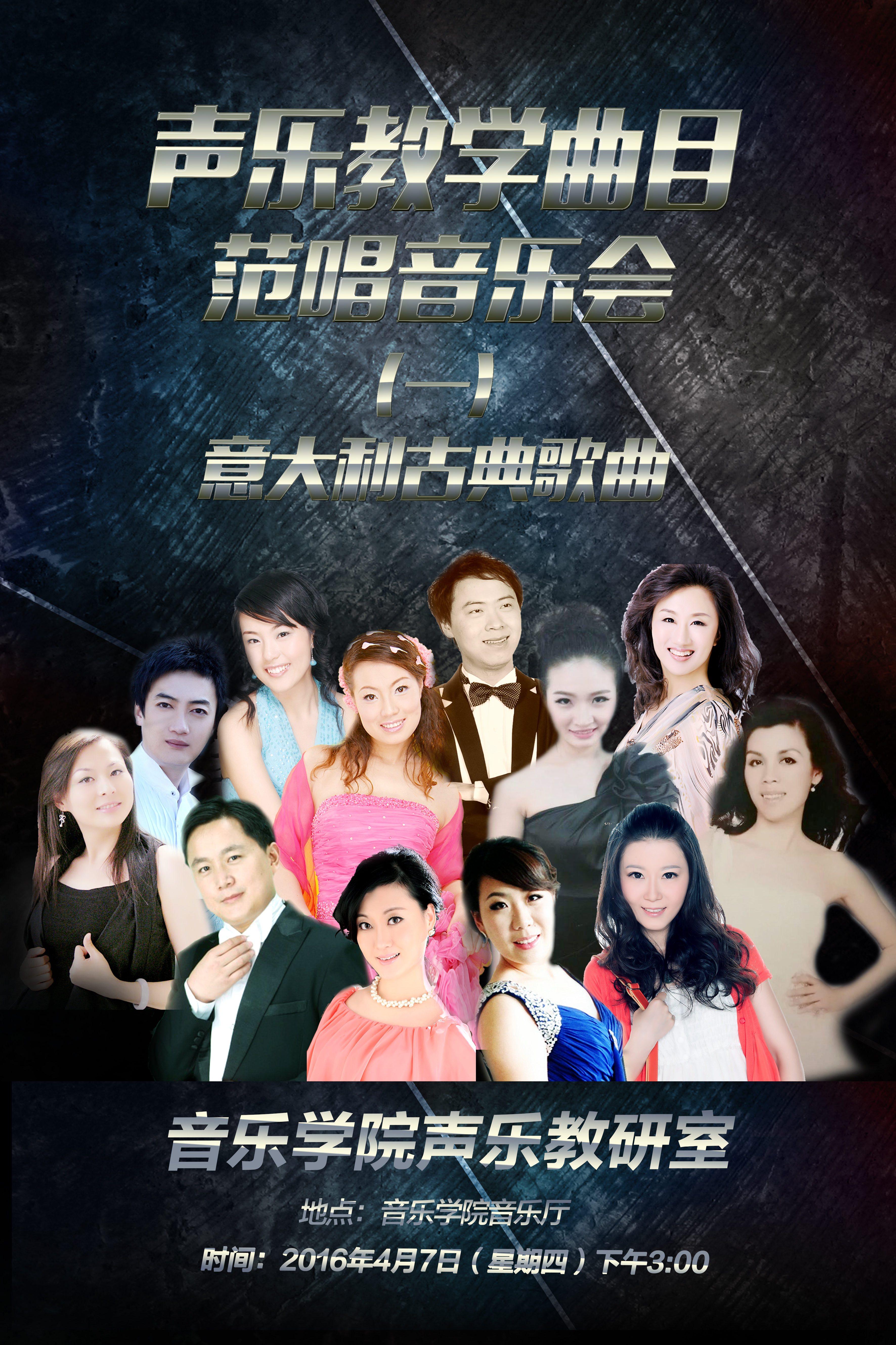 2016年4月7日下午三点,在永利y23455音乐厅举办了一场精彩纷呈、别开生面的音乐会——《声乐教学曲目范唱音乐会》。此次音乐会由永利y23455声乐教研室组织主办,部分声乐教师参加演唱,学校教务处领导和永利y23455师生观看了演出。