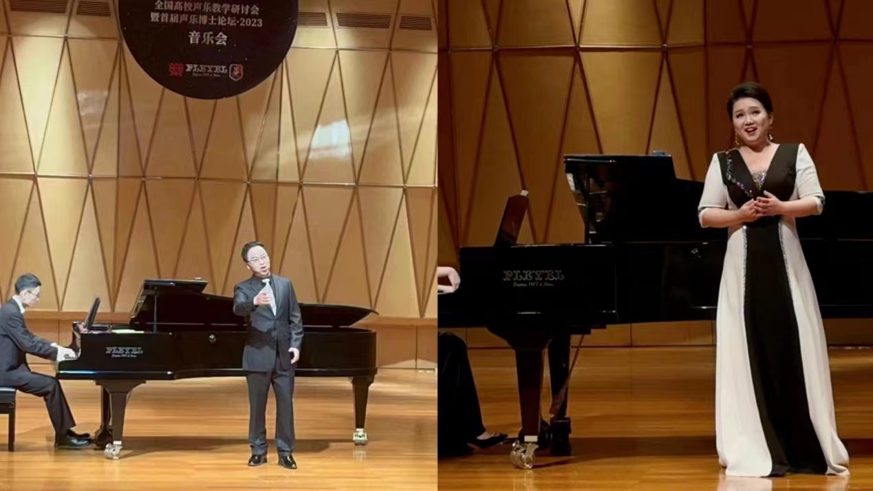 在研讨会结束当晚的音乐会上,徐定兴老师和卢泓予老师分别登台演唱了《我的江河水》和《珠宝之歌》两首作品,他们精湛的演唱技巧和细腻的音乐处理赢得了现场观众阵阵掌声和欢呼声,展示了我院青年教师的风采。