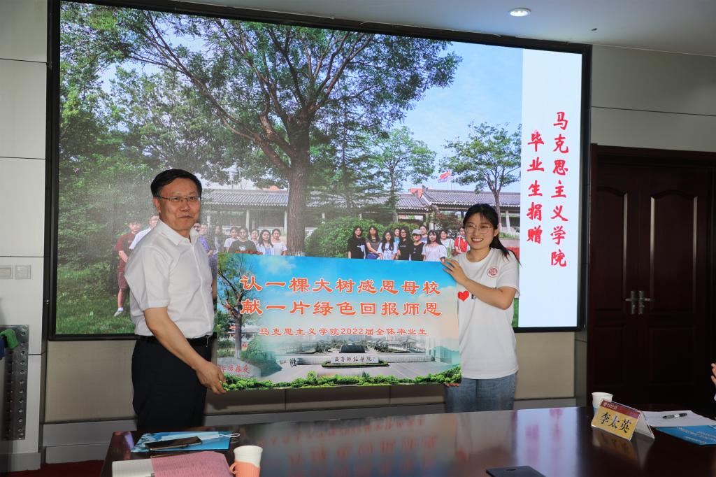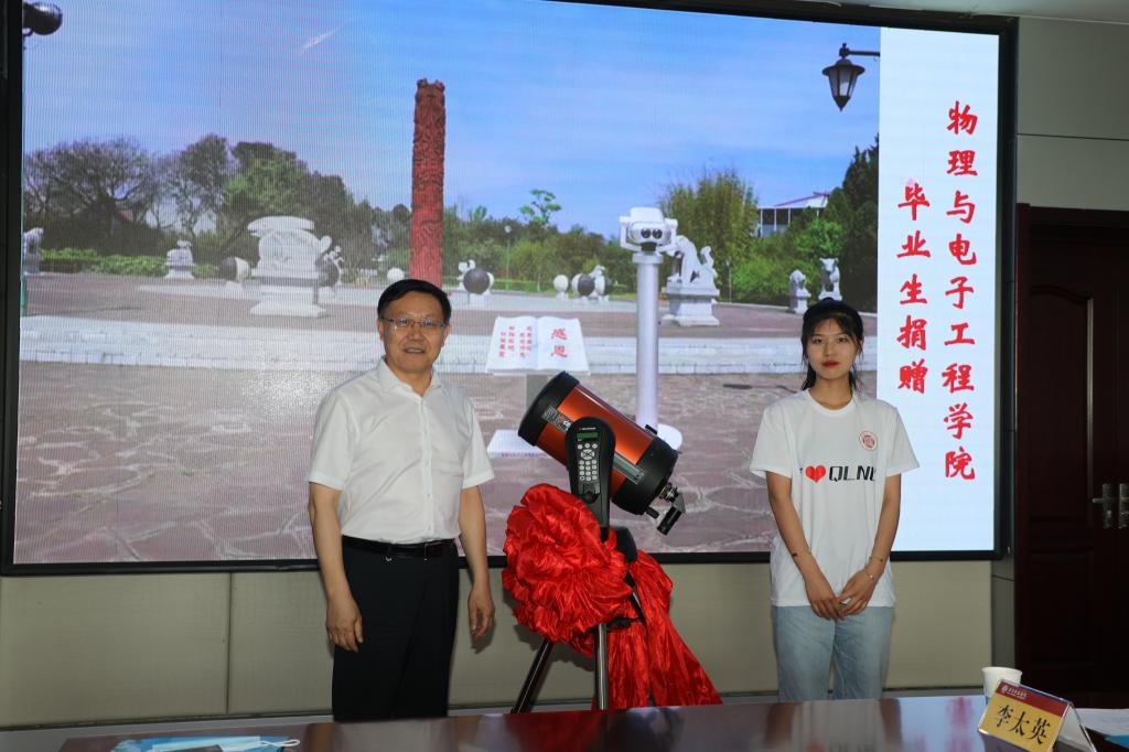 为感谢学校对毕业生的悉心培育,马克思主义学院毕业生代表向学校捐赠“认一棵大树感恩母校,献一片绿色回报师恩”;物理与电子工程学院全体毕业生向母校捐赠一架天文望远镜,表达“感念师恩、感谢母校、脚踏实地、仰望星空”的美好祝愿。林松柏代表学校向毕业生代表颁发了“校友联络员聘书”和“毕业纪念礼盒”。礼盒中包含着学校书记和校长致2022届毕业生的一封信、毕业纪念钥匙扣、师院书签、师院定制口罩。毕业纪念礼物满载着母校对毕业生的关爱;毕业生回馈母校的礼物,是学校建设发展的宝贵资源,更是学校永远引以为傲的亮丽名片。