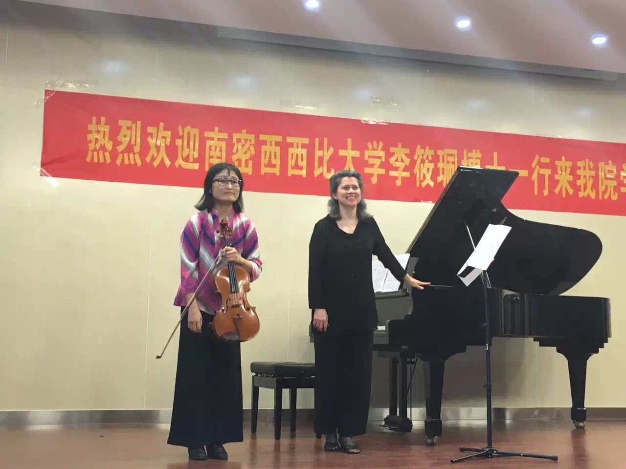 12月17日,美国南密西西比大学李筱珮博士(中提琴)、Elizabeth Moak博士(钢琴)、Stacy Reischman Fletcher院长(舞蹈)一行莅临我校,举行中提琴钢琴音乐会,并为小提琴、钢琴、舞蹈专业开设了大师班。