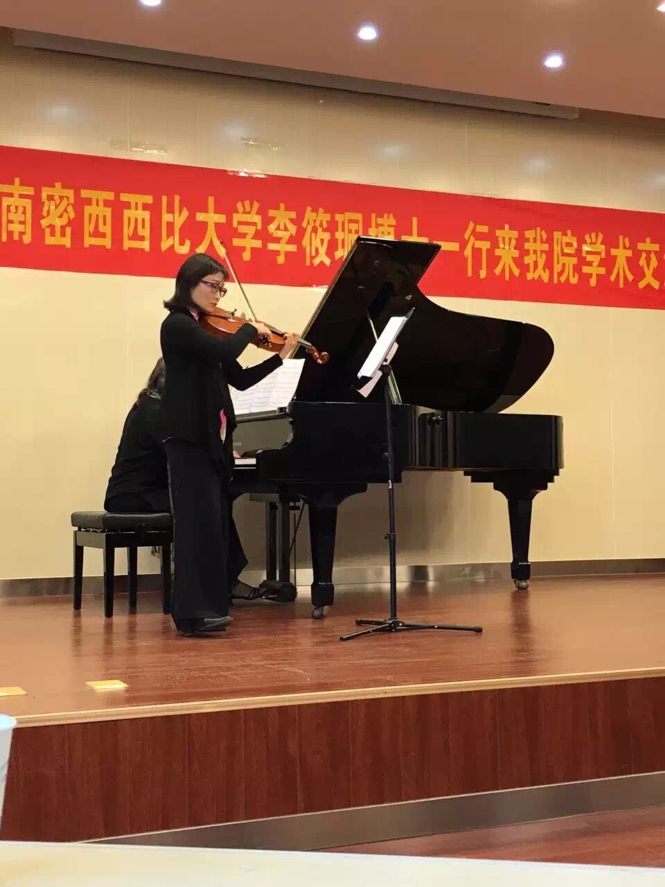 17日下午13:50,李筱珮博士、Elizabeth Moak博士中提琴、钢琴音乐会在永利y23455音乐厅拉开序幕,两位专家精湛的演奏和讲解赢得现场师生的热烈掌声。与此同时Stacy Reischman Fletcher院长的舞蹈大师班也在进行中,为我们的舞蹈学专业的学生做了悉心的讲解与指导。音乐会结束后,永利y23455院院长窦曼莉、党总支书记万梅红、副院长常爱玲为三位专家颁发了客座教授的聘书。随后,李筱珮博士、Elizabeth Moak博士还分别在1139会议室、音乐厅举行小提琴、钢琴大师班,吸引了众多的师生前来观摩学习。