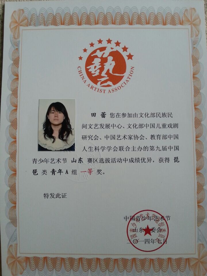 我院学生田蕾、张秋子、汤樾、高淑芬、杨东方、李璇、张旭晨、王淼煜在第九届中国青少年艺术节山东赛区选拔赛中成绩优异,分别荣获琵琶组一、二、三等奖。