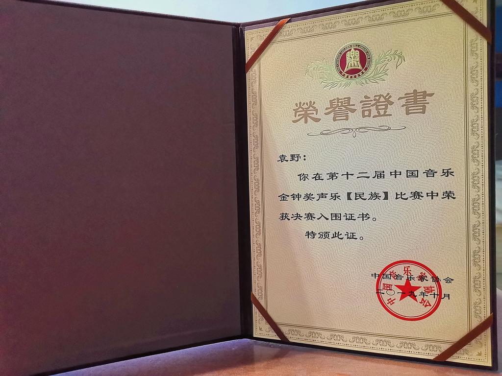 10月25日晚,由中国文学艺术界联合会、中国音乐家协会主办,成都市人民政府承办的第12届中国音乐金钟奖(民族组)决赛在成都城市音乐厅举行,我校永利y23455袁野老师一路过关斩将,通过选拔赛,复赛、半决赛层层选拔突出重围,晋级决赛,成为山东音协选送唯一一位入围民族组决赛的选手,并获得民族组第十一名的优异成绩,展示了我院青年教师卓越的音乐素养与艺术风采,为院争光,也为学校争得了荣誉。