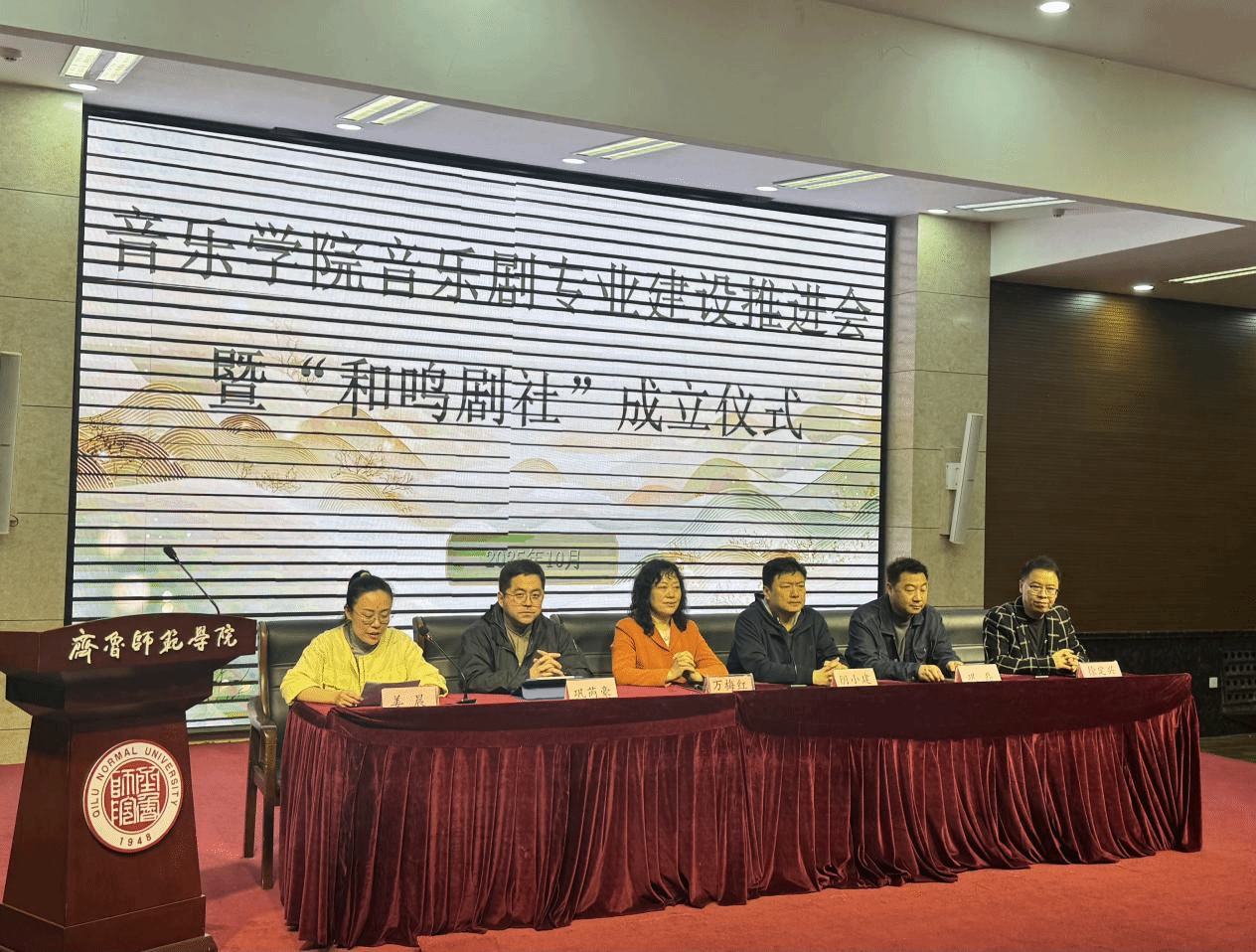 10月15日,永利y23455隆重举行音乐剧专业建设推进会暨“和鸣剧社”成立仪式。会议特邀中国音乐剧协会山东示范基地主任巩磊、导演巩芮豪出席。永利y23455院长万梅红、党委书记阴小建、副院长徐定兴、声乐教研室教师代表、团总支全体辅导员与“和鸣剧社”全体成员共同参加。会议由党委副书记姜晨主持。