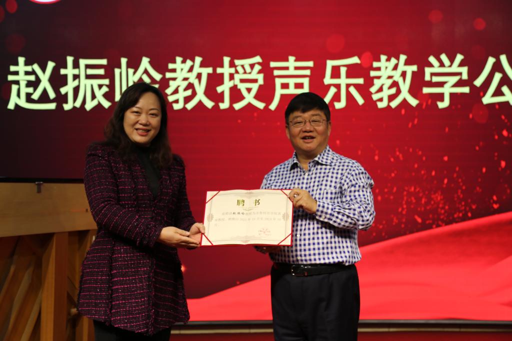 赵振岭教授的讲座内容丰富、学术严谨、针对性强,整场的授课过程精彩绝伦、掌声不断,大家被其高水平演唱、丰富的教学手段和立竿见影的教学效果所征服,在场师生受益匪浅。万梅红院长为赵振岭教授颁发永利y23455客座教授聘书。
