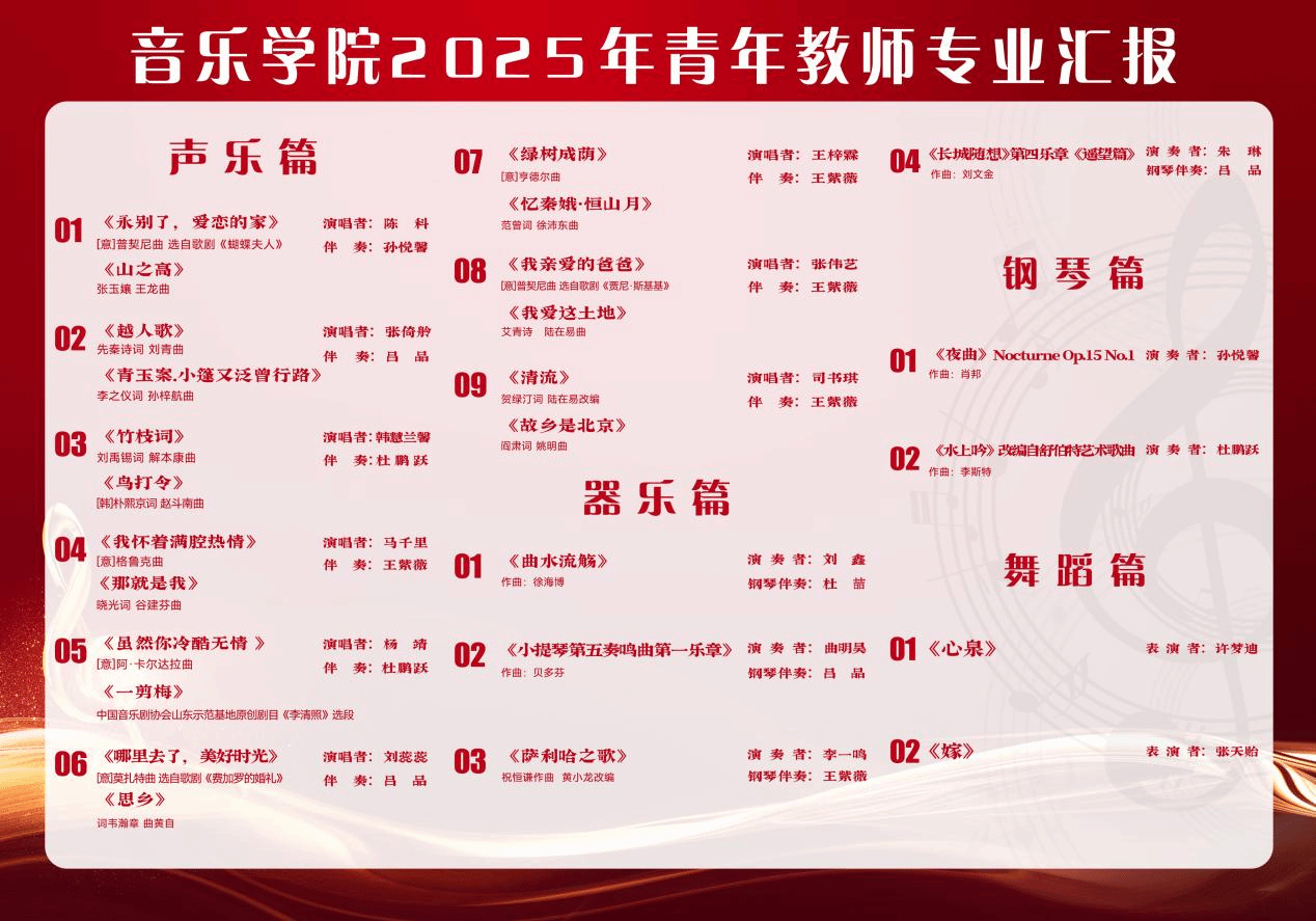 声乐篇以中西对话为主线,青年教师们先后演绎了多首不同时期、不同风格的中外经典作品,以扎实的唱功和细腻的情感处理,在钢琴伴奏的默契配合下,为观众带来一场跨越时空的音乐之旅。随后进行的器乐与钢琴篇,则展示了青年教师多样的器乐演奏实力:竹笛、小提琴、大提琴以及二胡独奏接连上演,音乐或婉转流畅,或激昂深沉,或充满民族风情,或饱含家国情怀。钢琴独奏则呈现出浪漫主义的诗意印象与如水般的灵动旋律,充分展现了专业技巧与音乐表现力。舞蹈篇作为压轴亮相,将整场汇报从听觉享受延伸至视觉审美,青年教师舞者以富有感染力的肢体语言,生动诠释了作品内在的情感与意境,为汇报会画上了圆满的句号。