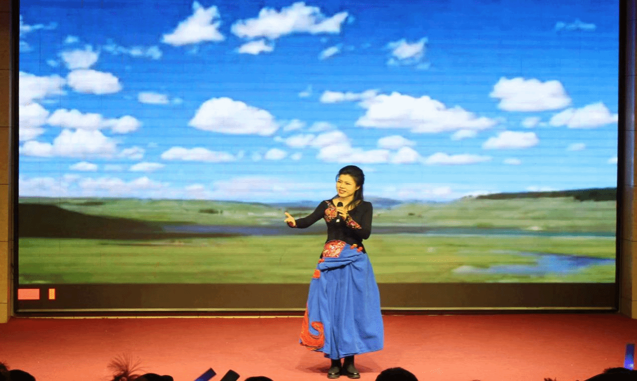 声乐教师张伟艺演唱了融合维吾尔族音乐韵味的歌曲《一杯美酒》。歌曲中轻快灵动的节奏,婉转悠扬的旋律,质朴热烈的语言,表达了人们对幸福生活的热爱和对美好情感的向往。