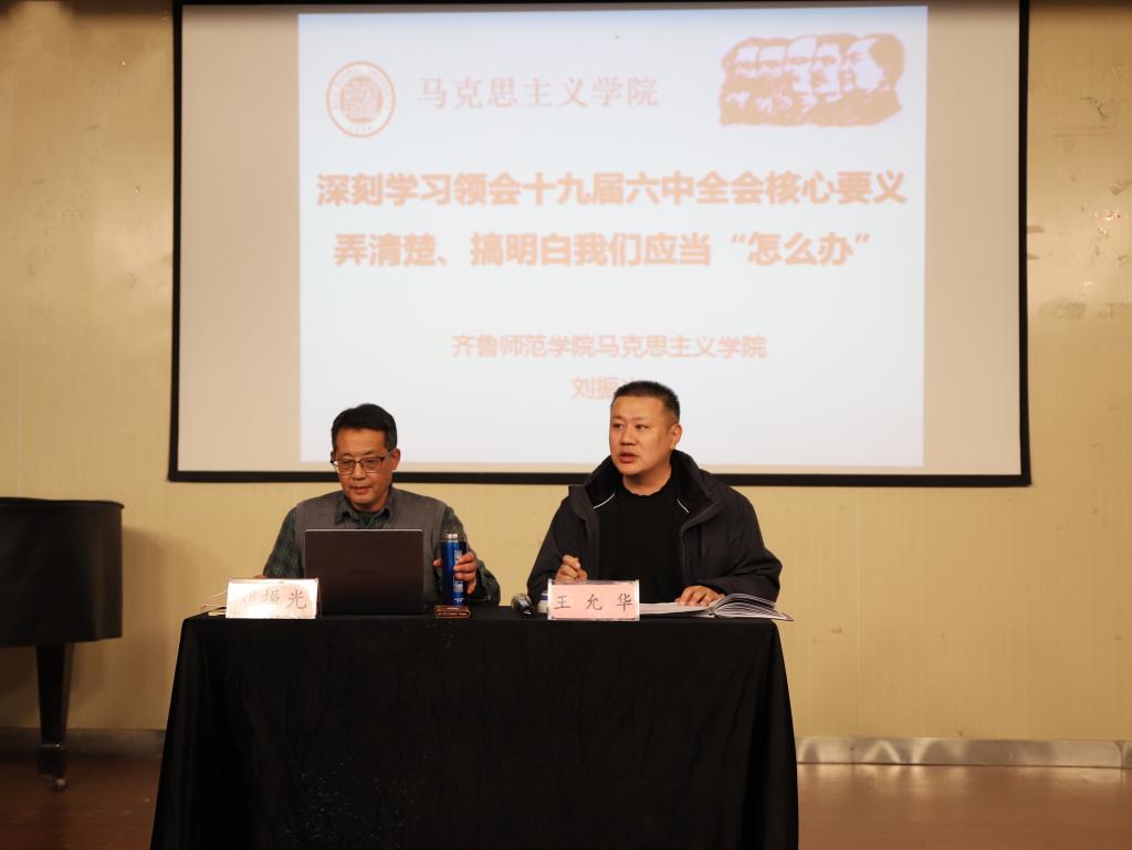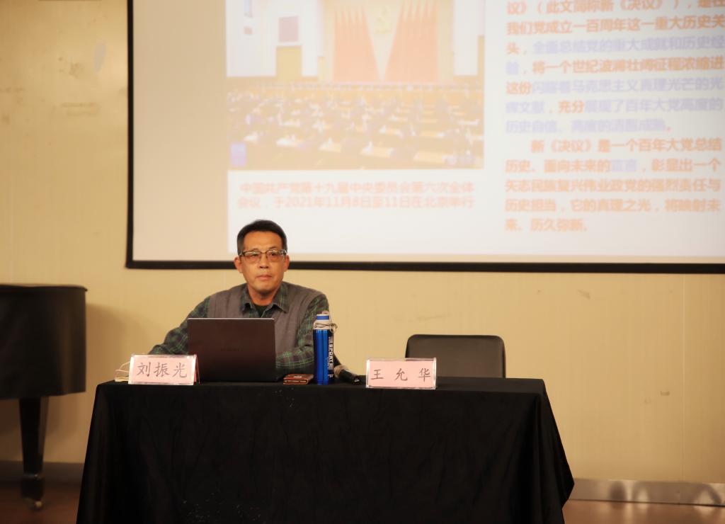 为深入学习和领会党的十九届六中全会的重大意义,12月23日下午,永利y23455邀请马克思主义学院刘振光教授,在音乐厅开展“深刻学习领会党的十九届六中全会核心要义” 弄清楚、搞明白我们应当“怎么办”的专题学习报告。永利y23455全体教师、全体学生党员参加了本次专题学习,会议由党总支书记王允华主持。