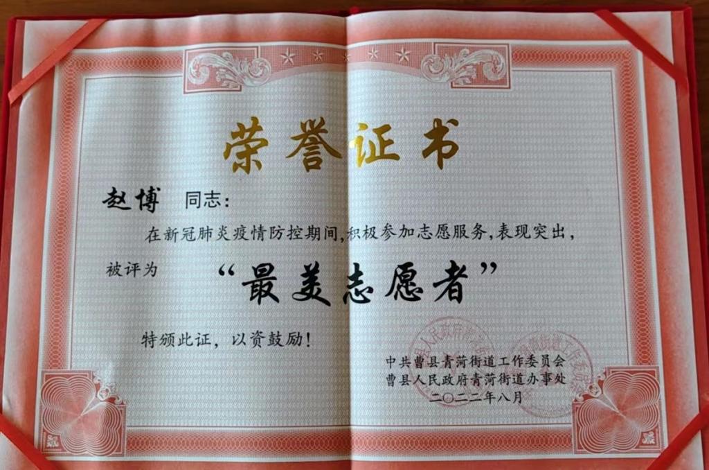 今年7月,曹县突发新冠疫情,形势严峻,赵博同学闻令而动,主动请缨,奔赴抗疫一线,顶高温、冒酷暑,积极参与疫情防控工作,用志愿精神点亮了青春梦想,用实际行动彰显了新时代大学生的责任与担当,用无私奉献书写了青春华章。赵博同学的志愿服务温暖和感动着身边的每一个人,村民们对他的志愿服务精神纷纷竖起大拇指,称赞他有德学、有爱心。赵博同学还被评为“最美志愿者”荣誉称号。