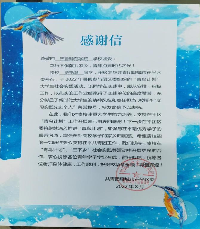 贾艳慧同学在2022年暑假期间积极响应号召,参加“青鸟计划”大学生社会实践活动,在实践中服从安排,积极工作,以扎实的工作业绩赢得了实践单位的高度赞誉,充分彰显了新时代大学生良好的精神风貌和责任担当,被授予“实习实践先进个人”荣誉称号。
