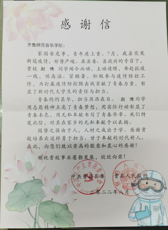 近日,我校永利y23455接连收到两封感谢信,一封是来自山东省菏泽市曹县人民政府的感谢信,感谢2021级音乐学三班赵博同学在暑假期间积极参与当地疫情防控志愿服务,为打赢疫情防控阻击战贡献了青春力量。另一封是来自共青团聊城市茌平区委的感谢信,感谢2021级音乐学三班贾艳慧同学在暑期积极参加“返家乡”社会实践,与当地干部共同奋斗在脱贫攻坚战第一线,得到了实践单位的肯定和表扬。
