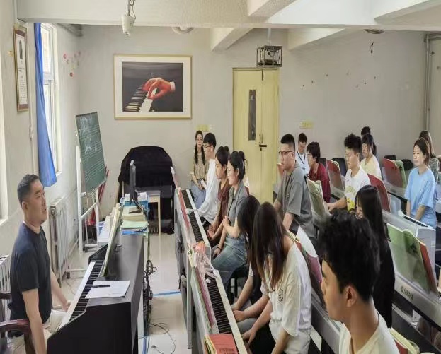 林松柏先后听了杨靖和刘源两位老师的技能集体课。杨靖老师教授的声乐集体课主要从歌曲《绒花》的音乐分析、歌词语调解读、对学生艺术情感的激发、歌唱审美与学生间互相教唱这些环节展开。其中在知识讲授环节,教师对“歌唱状态积极”、“以情带声”、“高位置、声区统一”、“声音呈现集中、明亮、圆润”获得的学习效果较好。刘源副教授在21级音乐学班的钢琴集体课上,围绕师范类钢琴课的课程目标和考核要求,对中外钢琴作品《北风吹》、《甜梦》和车尔尼两首练习曲等进行了细致的讲解。在对作品的内容、风格以及文化内涵等进行讲述的同时,对学生的读谱、练琴方法等也提出了较高的要求,使学生的学习兼顾了美育和可操作性。