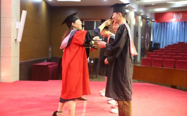 院长万梅红、副院长桑潇为同学们颁发学士学位证,并拨穗正冠。毕业生学位帽上的帽穗,从右边拨到左边,代表着一份肯定与衷心的祝福。这一拨代表着麦穗已经成熟,象征着同学们已学有所成,寓意新征程的开始,可以在社会中大展身手,乘风破浪,扬帆远航。