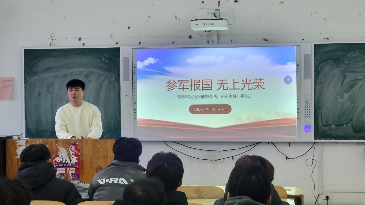 为响应征兵号召,深化国防教育,培养学生爱国情怀和责任意识。12月21日,永利y23455举办大学生国防教育暨2024年度征兵动员会。会议由学院国防教育宣讲团成员、退役复学学生宋英杰主讲。