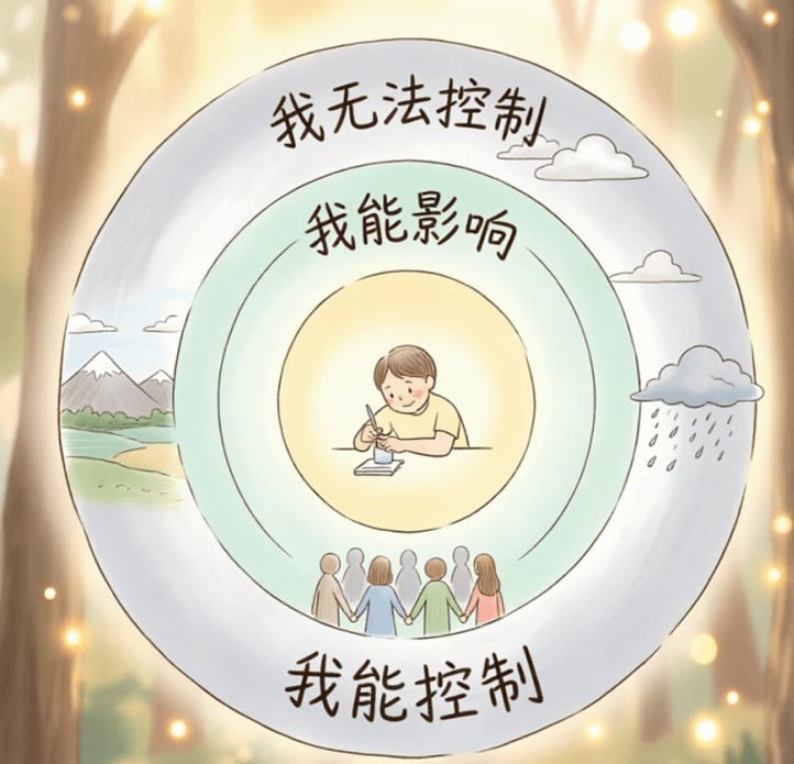·三圈理论。焦虑最消耗人的地方,在于它是一团模糊、混乱且无处不在的“情绪迷雾”。当你把它写下来并画圈分类时,你实际上是在做一件非常有掌控感的事情:把“情绪问题”转化为了具体的“管理问题”。下一次焦虑的想法像潮水般涌现时,你不妨拿出一张纸,画出三个同心圆,把你的担忧分门别类地放进不同的圈层:我能控制的(例如:现在做三次深呼吸,让自己平静一点);我能影响的(例如:为即将到来的考试复习其中一部分内容);与我无关的(例如:别人会怎么看我、未来会不会发生不好的事)。