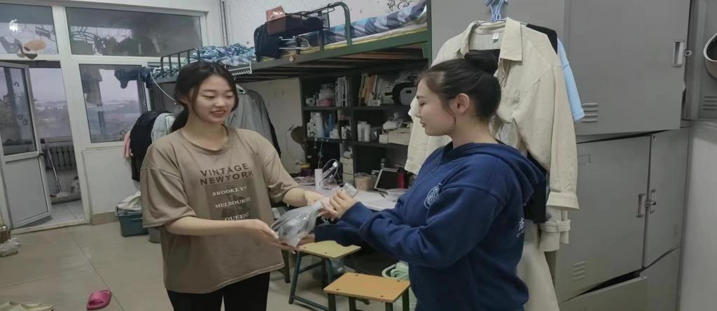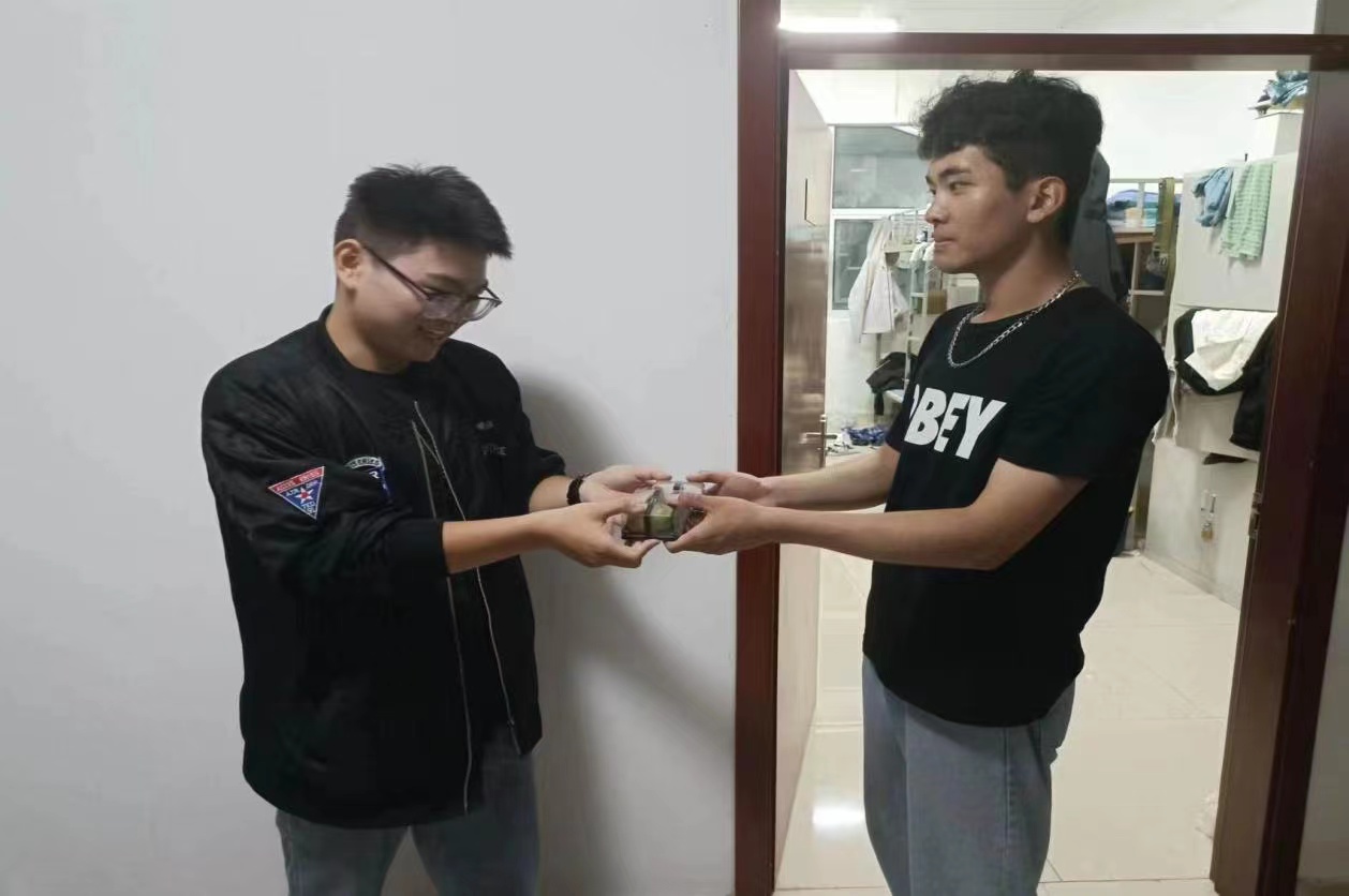 宿舍里,学生党员代表学院为新生送上中秋月饼与祝福,同时交流学习生活状况和假期安排,并鼓励学弟学妹要把握时光、努力学习。