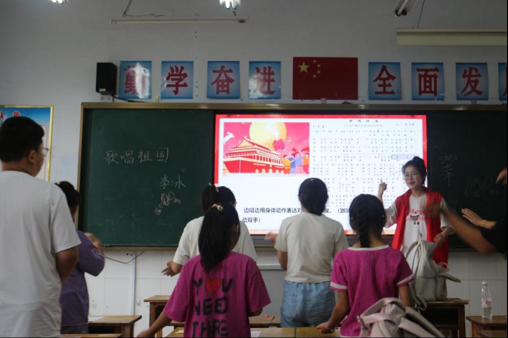 音乐是文化传承的重要载体。队员们心潮澎湃,将《歌唱祖国》唱响课堂,厚重的爱国情怀通过音乐的形式传递到孩子们的心间。孩子们从羞涩到自信,在队员们的带动下大声唱出了对祖国真挚的热爱。