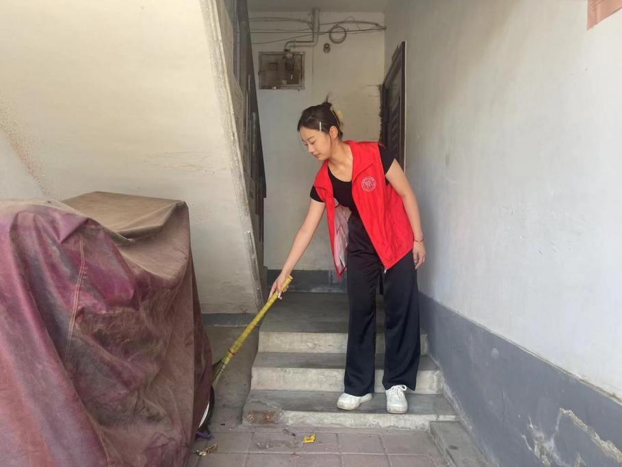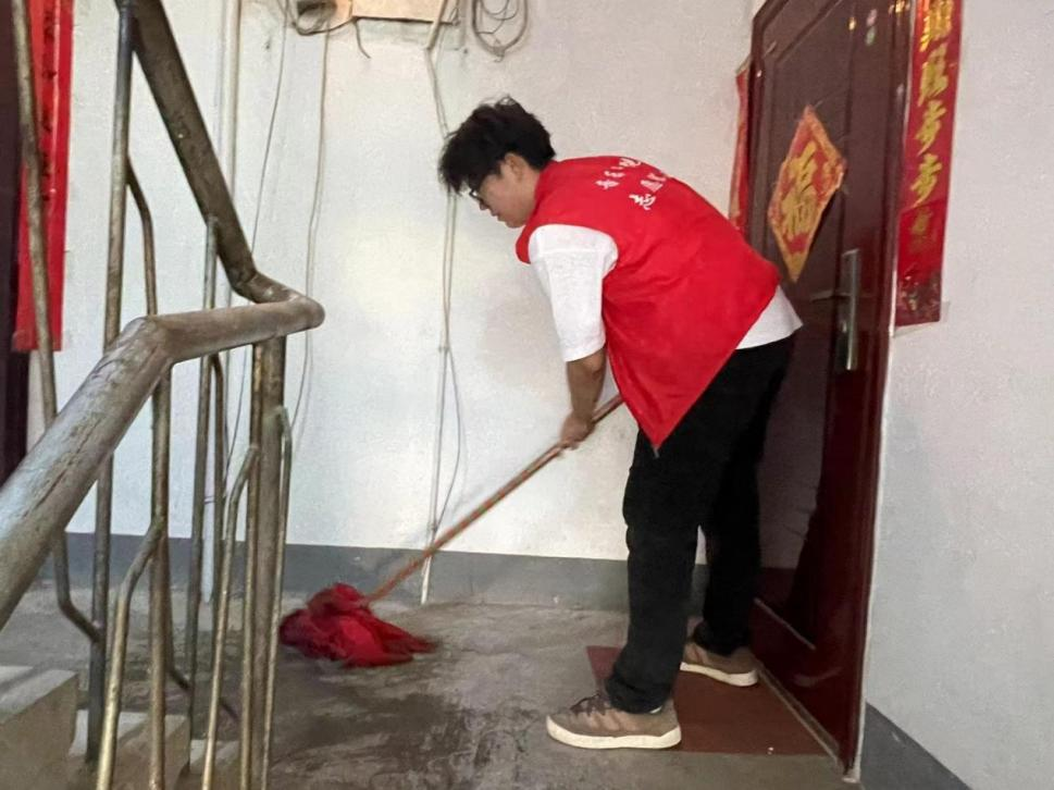 上午,服务队志愿者们投入到了打扫楼洞卫生的工作中。他们手持清洁工具,分工明确,拿着扫帚和拖把细致地清扫地面,整理楼道杂物,不怕脏、不怕累,让楼道环境整洁如初,为社区居民营造舒适的居住环境。