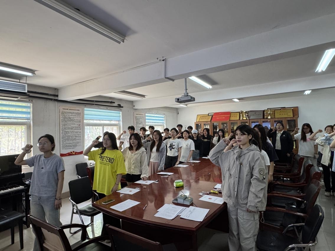 入团仪式在庄严的国歌声中拉开帷幕。刘秋雨宣读了2025年度新发展团员名单,向新加入团组织的新团员表示了祝贺并颁发了团员证和团徽。随后,在优秀共青团员马一诺的领誓下,全体新团员面向鲜红的团旗,高举右拳,以铿锵有力的誓言庄严宣誓。洪亮的誓言,展现着他们的蓬勃朝气与坚定信念。最后,全体团员齐声高唱中国共产主义青年团团歌,整齐嘹亮的歌声展现了团员们的精神风貌,表达了他们加入共青团的荣誉感和为组织贡献青春力量的坚定信念。
