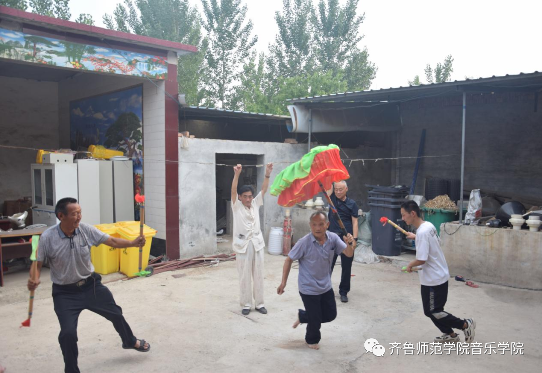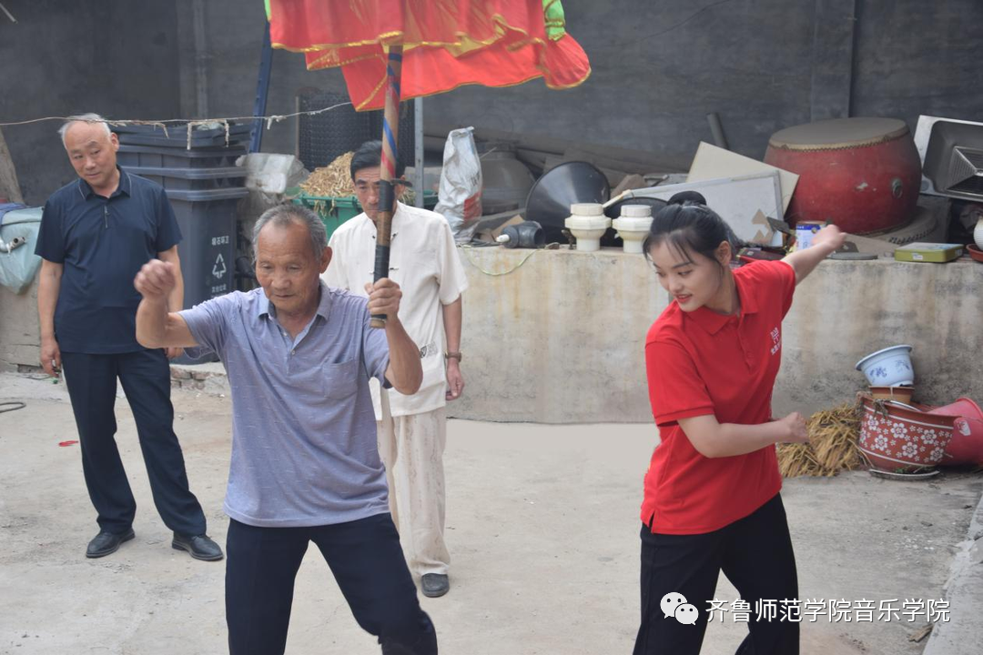 下午,团队成员深入董家村,在村支部书记鲁文慧的带领下了解到当地非物质文化遗产——董家伞棍鼓舞。团队成员通过走访伞棍鼓舞传承人董传祯、董梦华老先生,了解到棍鼓舞的悠久历史、源于演兵阵法的表演阵型,以及融合曲艺文化的元素。